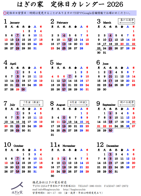 2025年12月13日 はぎの家からのお知らせ はぎの家・営業案内(12月13日更新) 定休日 ・12月・1月:毎水曜が定休日です。 はぎの家のイベント 1月11日(日)に【失敗しないお墓づくりセミナー】を実施します。初めてお墓を建てる方や家族と共に理想のお墓を建てたい方に向けて、代表自らがご説明します。セミナーの詳細はこちらのページをご覧ください。 2026年はぎの家・年間カレンダー 大きい画像はこちらをご覧ください